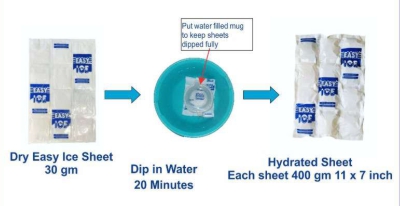 ⇒ To hydrate, take a small tub about 16" dia, fill it with water. Dip dry Easy Ice sheets in the tub. At their own Sheets remain floating, to dip them, put one or two water filled mug over the sheets. Let the sheets remain dipped for 20 minutes or more. The sheet absorb water automatically and each cell will swell about 2 cm thick.